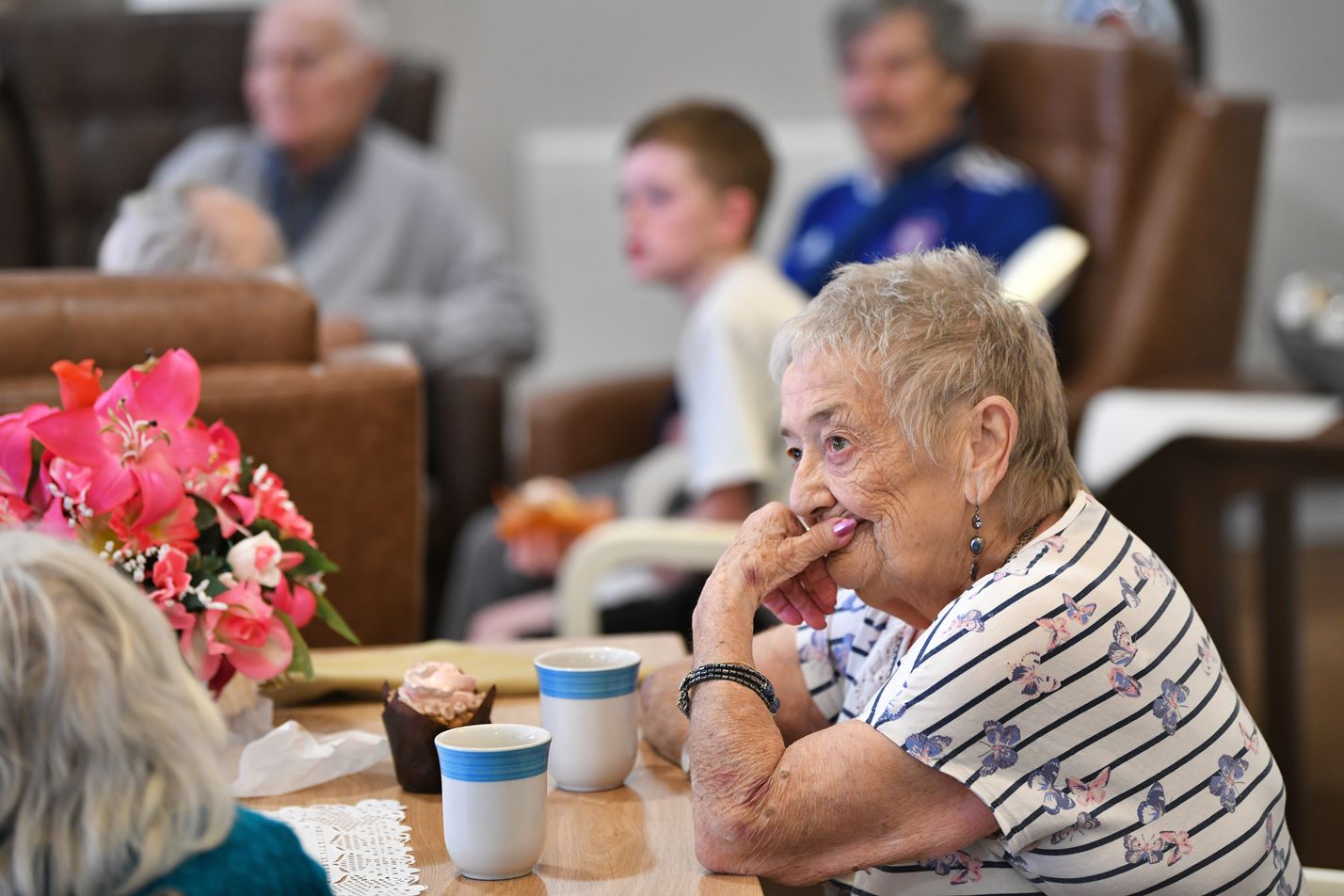 It started outside in the garden, with Martin telling jokes (Taylor getting the answers) and Stan doing a wonderful impersonation of his pet dove that used to follow him when he went to the shops. Then we moved inside for a chat, a cuppa and a tower of cupcakes.