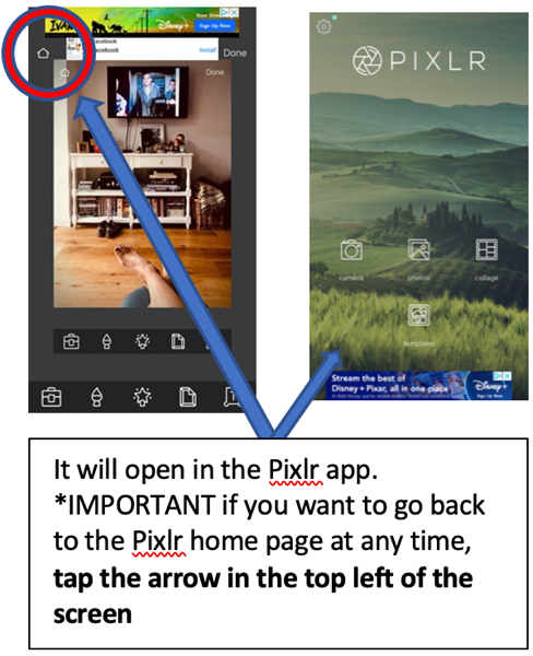 1.12 It will open in the Pixlr app. *IMPORTANT if you want to go back to the Pixlr home page at any time, tap the arrow in the top left of the screen.